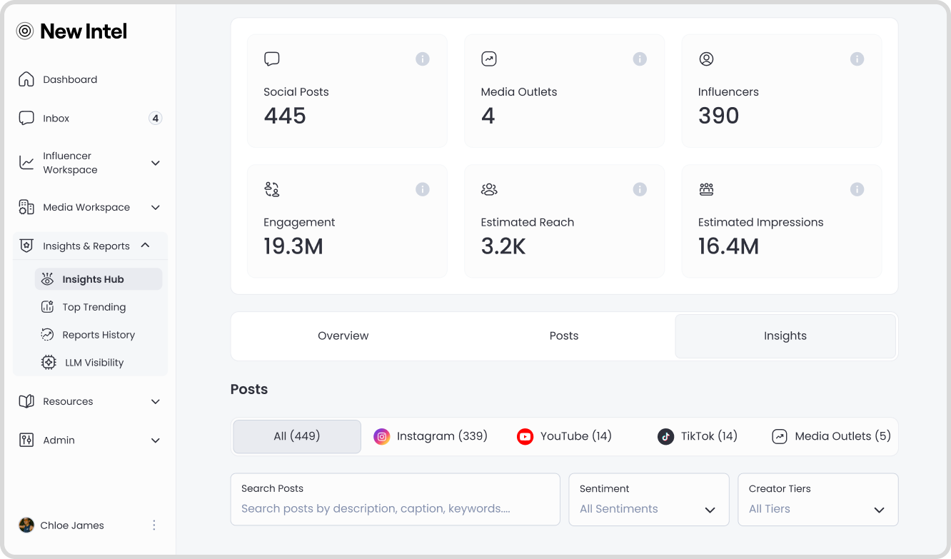 Stop waiting for quarterly reports. NewIntel gives insights teams real-time consumer intelligence, trend forecasting, and competitive benchmarking - powered by 2T+ conversations across every major platform.